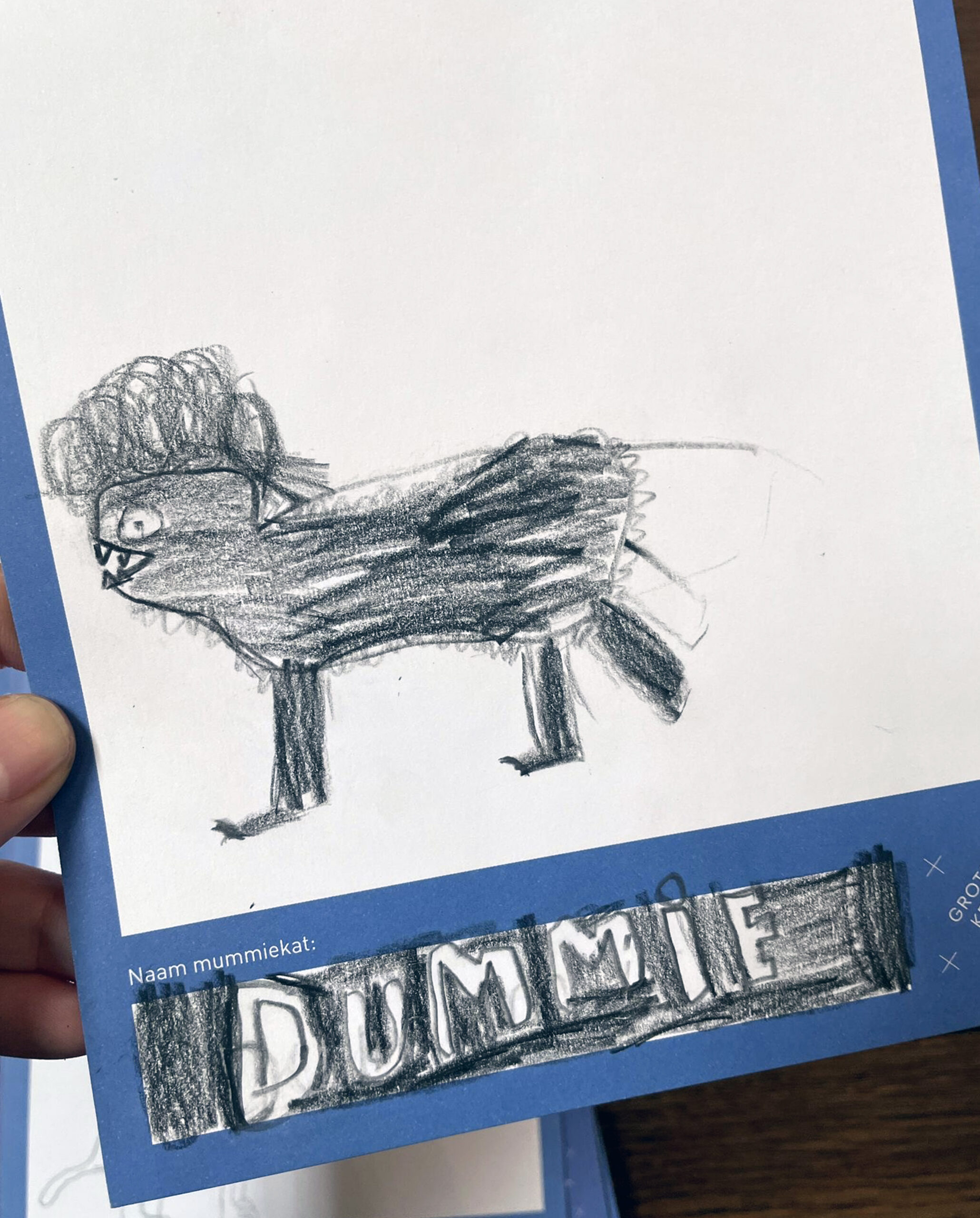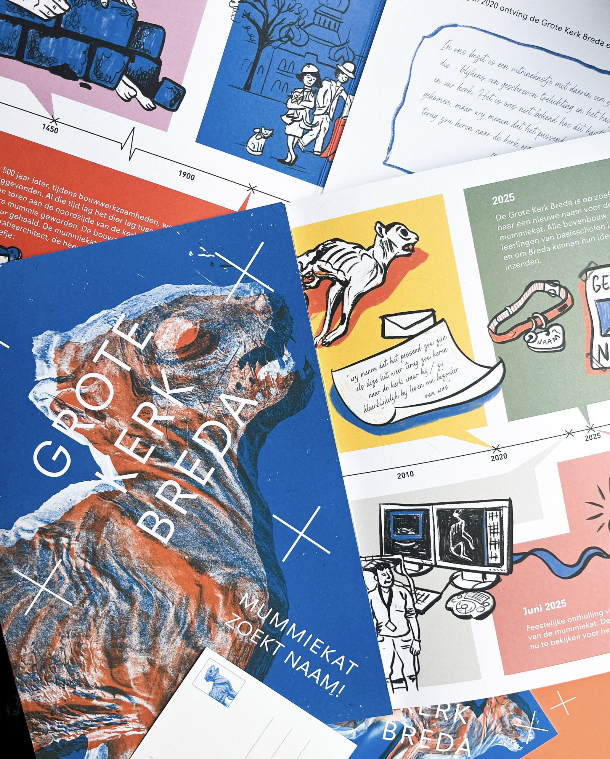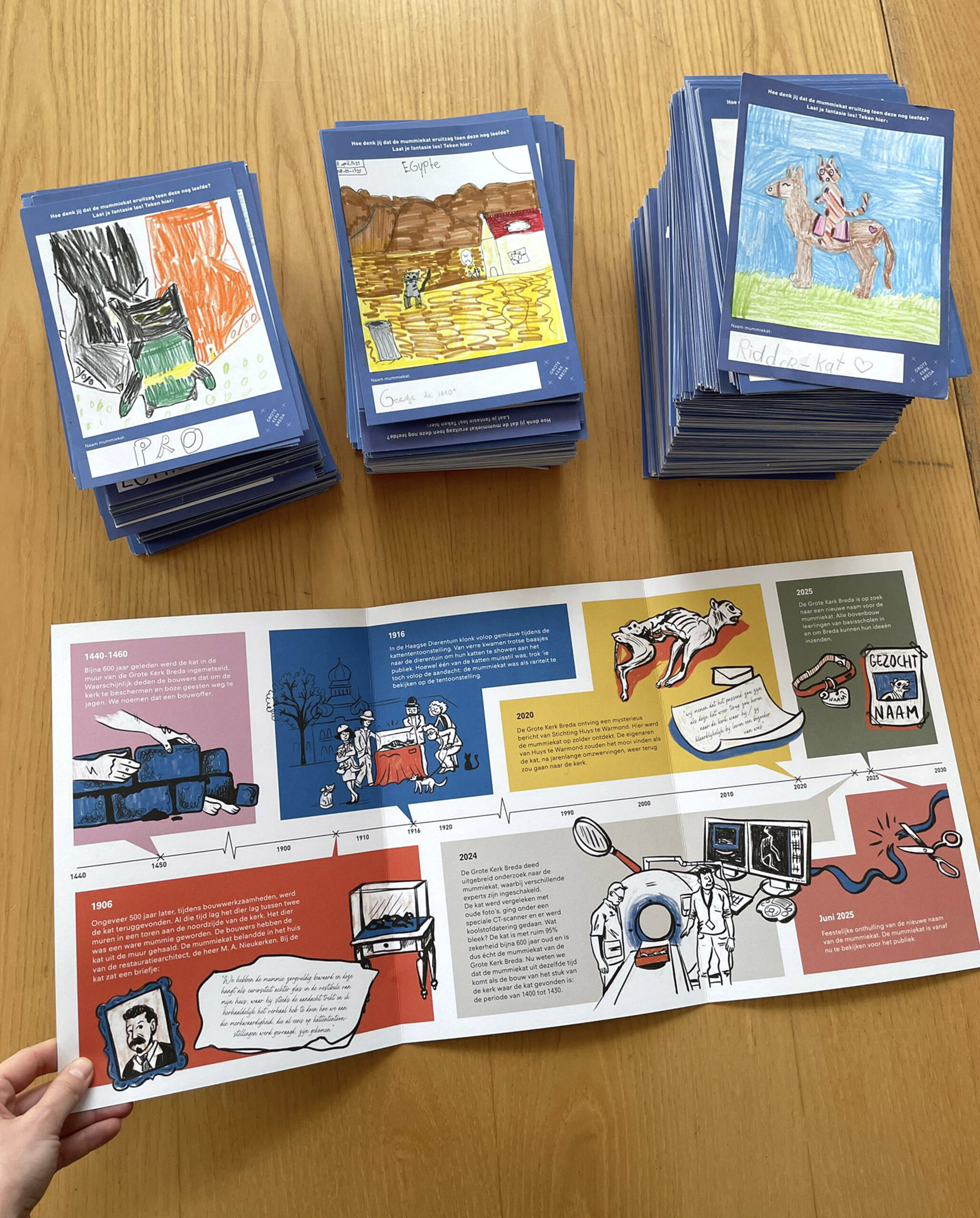 Mij werd gevraagd om te helpen om de campagne op te zetten. Er werden posters gemaakt in de huisstijl van Grote Kerk Breda, en dat beeld werd ook gebruikt ter promotie van de mummiekat. Verder was er een tijdlijn nodig die het verhaal en geschiedenis van Polleke uitlegt. Samen met het educatieteam van Grote Kerk Breda brainstormden we hoe we de inzendingen van de naam nog leuker konden maken; en hoe leuk als ze zelf kunnen tekenen hoe de mummiekat eruit zag? Er werd een lespakketje opgestuurd naar alle basisscholen in de omgeving; een brochure met informatie en tijdlijn, kaartjes waarop de kinderen hun inzending konden tekenen en gegevens achter konden laten, een ansichtkaart en sticker.